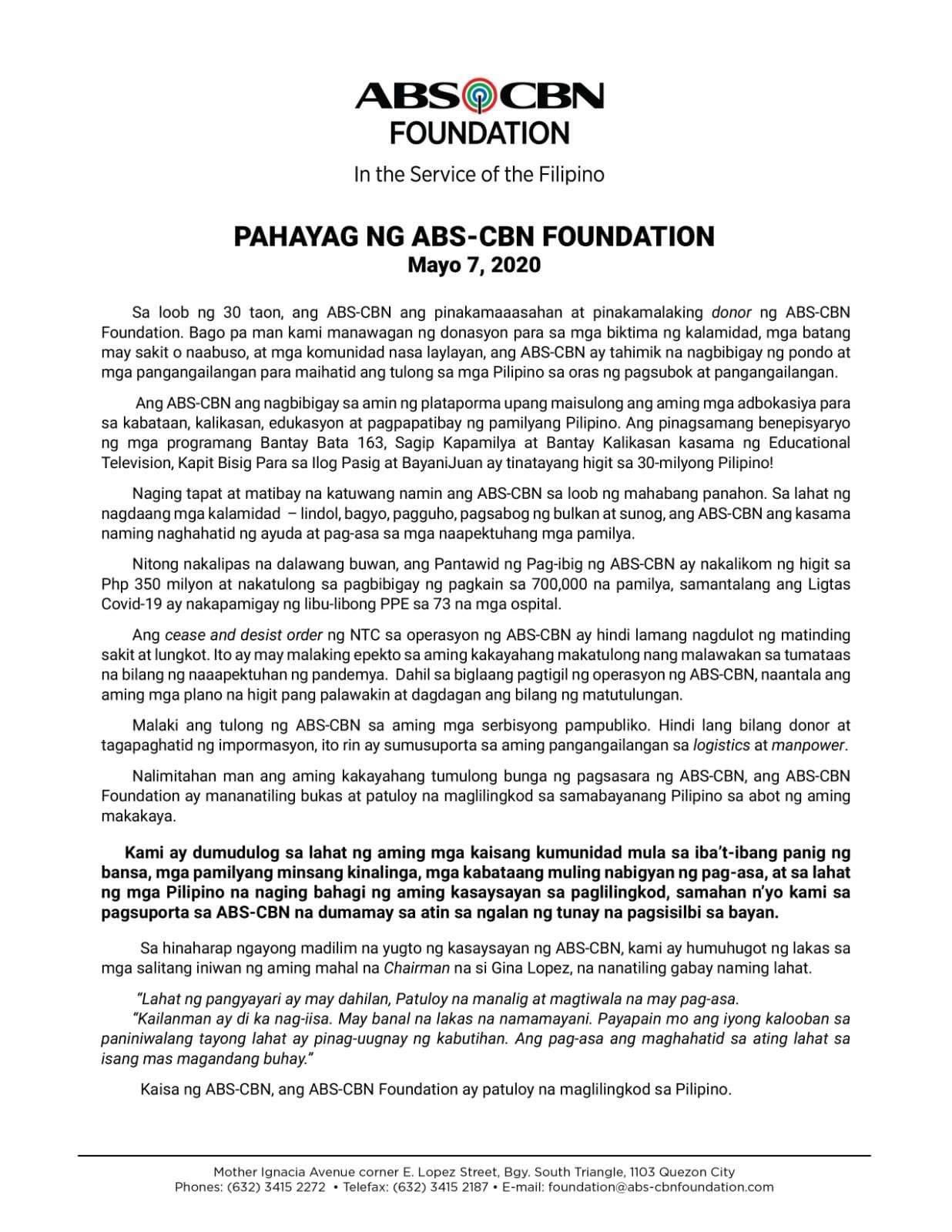 Dreamscape Entertainment On Twitter Pahayag Ng Abs Cbn Foundation