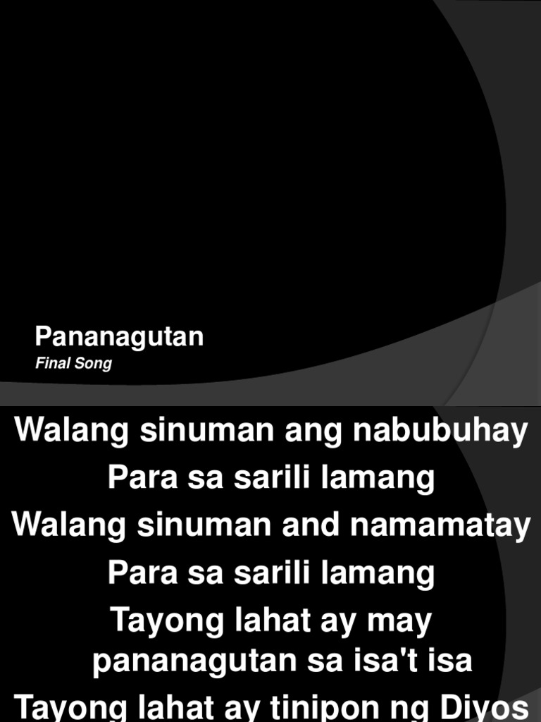 Walang sinuman ang nabubuhaybrpara sa sarili lamangbrWalang sinuman and namamataybrpara sa sarili lamangbrTayong lahat ay may pananagutan sa isat isabrTayong lahat ay tinipon ng DiyosbrNa kapiling nyabrSa ating pag mamahalan at panglilingkodbrsa kanino manbrTayo ay. Tayo ay magdadala ng balita na kaligtasan. Magagalit man kayo iwasan ninyo ang kayoy magkasala.