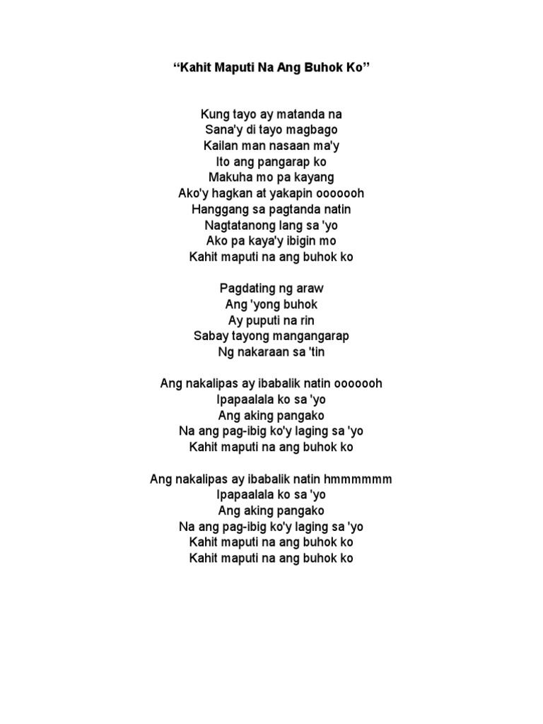Kahit Maputi na ang Buhok ko Lyrics. Browse for Kahit Tayo Ay Matanda Na song lyrics by entered search phrase. Kung tayo ay matanda na Sanay di tayo magbago Kailan man Nasaan may ito ang pangarap ko Makuha mo pa kayang.