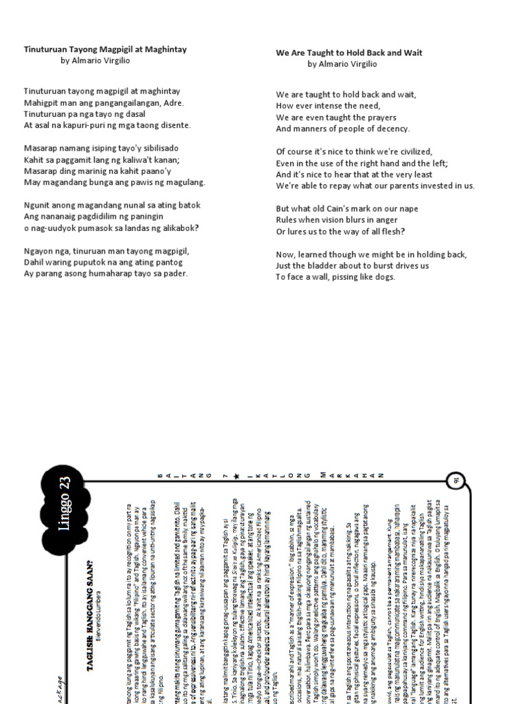 Tinuruan tayong magpigil at maghintay by virgilio almario analysis. A Filipino citizen who has been given the rank and title in recognition of his or her significant contributions to the development of Philippine arts and letters. You may choose any multimedia presentation tool. The poem teaches us to hold back and wait for our emotions to calm down first and think To whom.