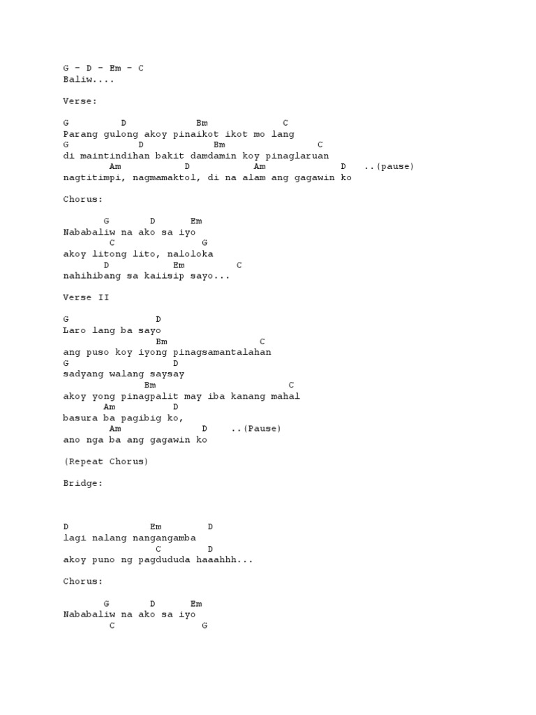 A d kahit sandali palayain ang pusong di mapigil bm d dm sanay tayong dalawa sa huling pagkakataon na ikay magiging akin verse3. Bb Paalis at pabalik F May baong yakap at suklian ng halik Bb Mag papaalam at mag sisisi F Habang papiglas ka ako sayo ay tatabi Bb Tayong dalawa lamang ang nakaka alam F Am Dm Bb Ngunit hindi na matanto kung sino nga ba ang pag bibigyan ko F Makikinig nga ba sa isipan na alam ang wasto Am Dm Bb Ngunit pipigilan ang pag ibig nya na totoo Bb. Alam mo ba na bagay tayong dalawa F G Am Mahal na mahal kita hindi ko lang talaga sinasadya F G Am Lakas na kasi ng epekto ng kagandahan mo F G Di ko talaga inakala na magkakaganito Am Ang tanging sarili ko F G Am Sanay pagbigyan mo na ko F G Am Di ko talaga matiis ang pagmamahal ko F San man tayo mag tagpo G Am Ako ay nandito F G Am Huwag ka.