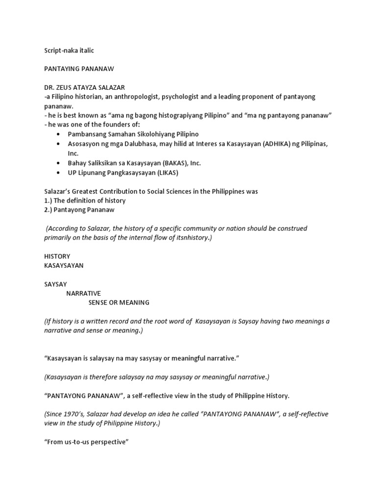 Exposition Critique and New Directions Abstract Ramon Guillermo This essay on Pantayong Pananaw From Us for Us Perspective. Sabi ni Salazar ang kasaysayan daw ay isang salaysay hinggil sa nakaraan na may saysay para sa sinasalaysayang pangkat ng tao o salinlahi. First the principle of using the national language as the primary means of communication in Philippine social sciences should serve as the principal and broadest basis of unity and fruitful discursive exchange.
